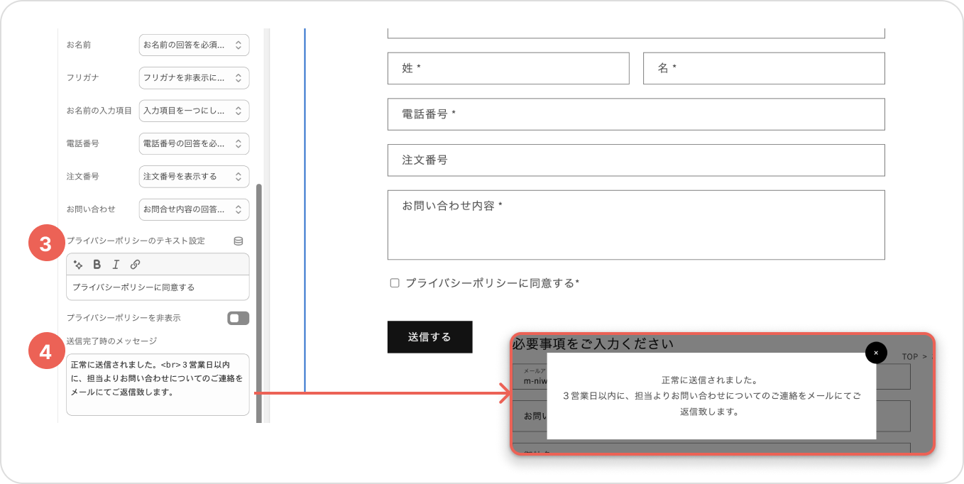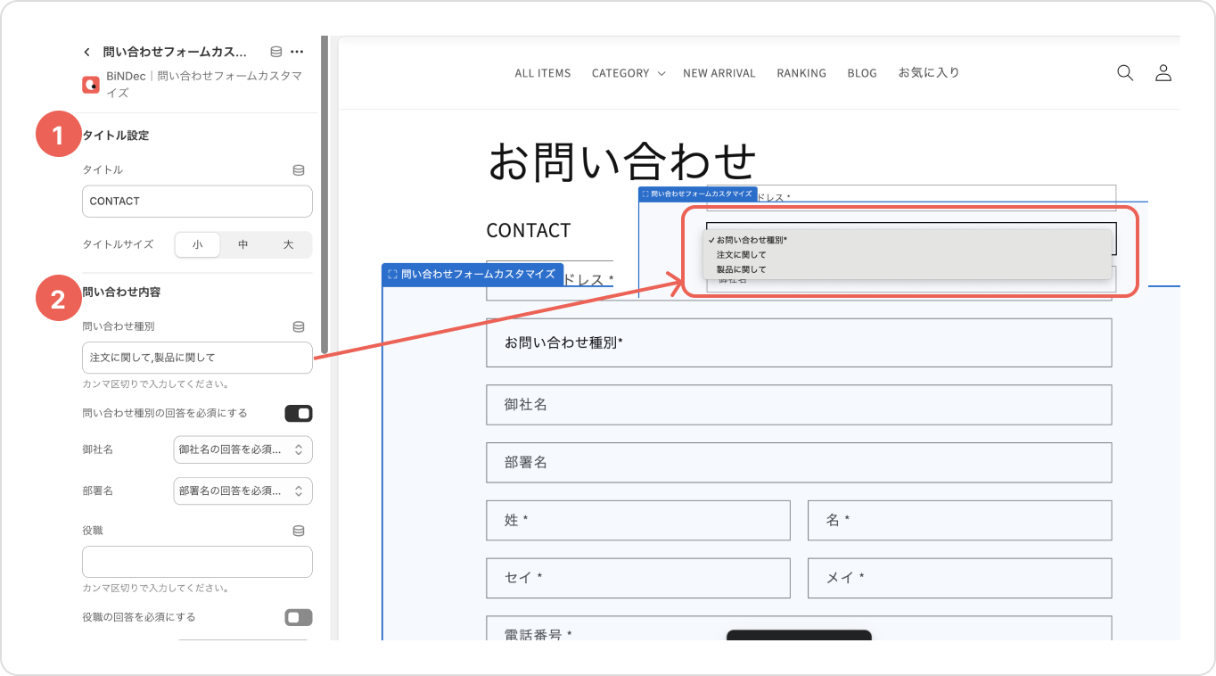 - 問い合わせ内容 ・問い合わせ種別 ・御社名 ・部署名 ・役職 ・お名前 ・フリガナ ・お名前の入力項目 ・電話番号 ・注文番号 ・お問い合わせ ※2.の項目内容は必須有無、または表示/非表示の指定ができます。