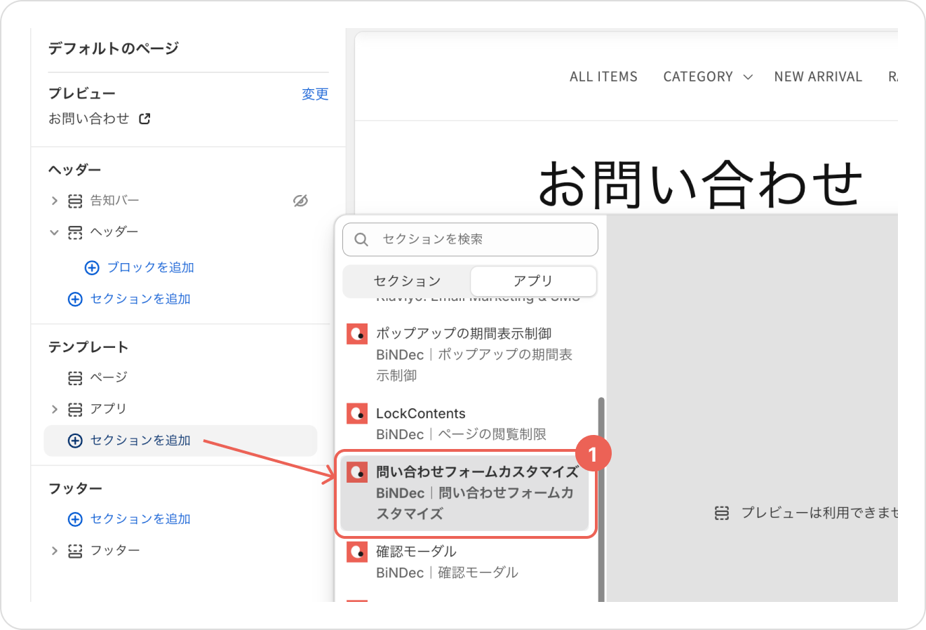 - テーマカスタマイズ画面にてストアの問い合わせページを開く>「セクションを追加」>「問い合わせフォームカスタマイズ」をクリックします。