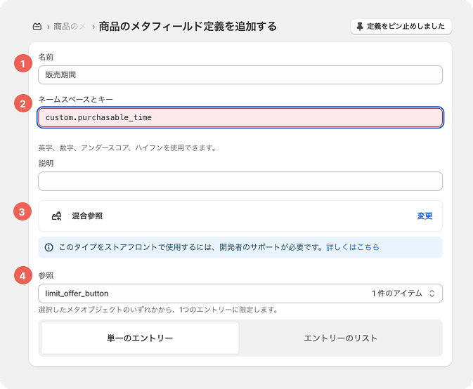 先ほど作成したのメタオブジェクト(定義)は、どの商品とも関連づけられていません。作成したメタオブジェクトを「商品」に紐づけるための項目を、本ページにて商品メタフィールドとして定義します。