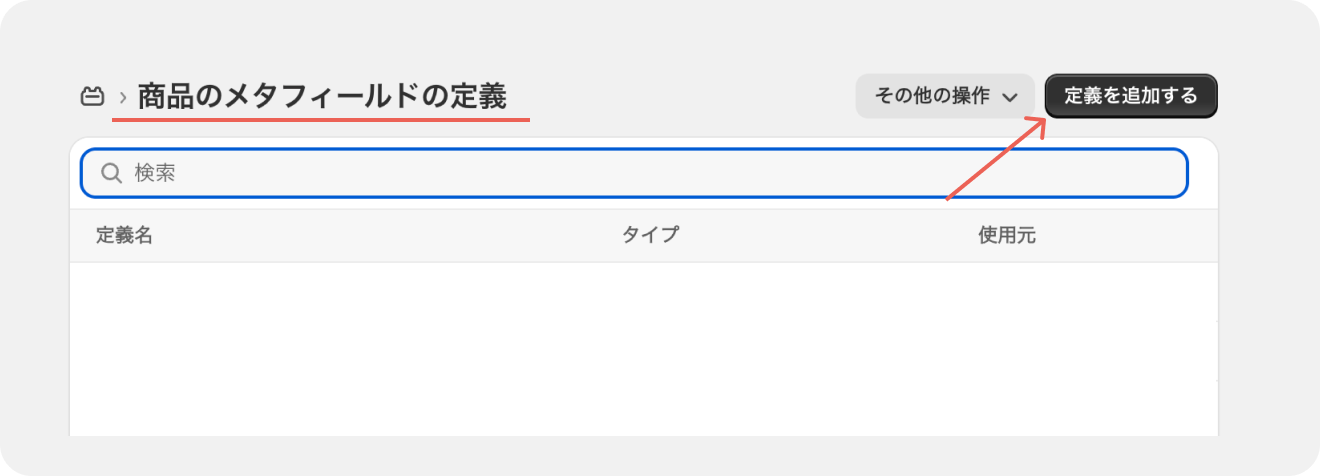 管理画面の設定>「メタフィールドとメタオブジェクト」>「メタフィールドの定義」セクション>商品>「定義を追加する」をクリックします。