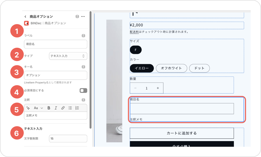 - キー名・・・管理側注文ページのLineitem Property名として使用される文言を任意で設定できます。項目とする場合、トグルボタンを押して設定を有効化します。
