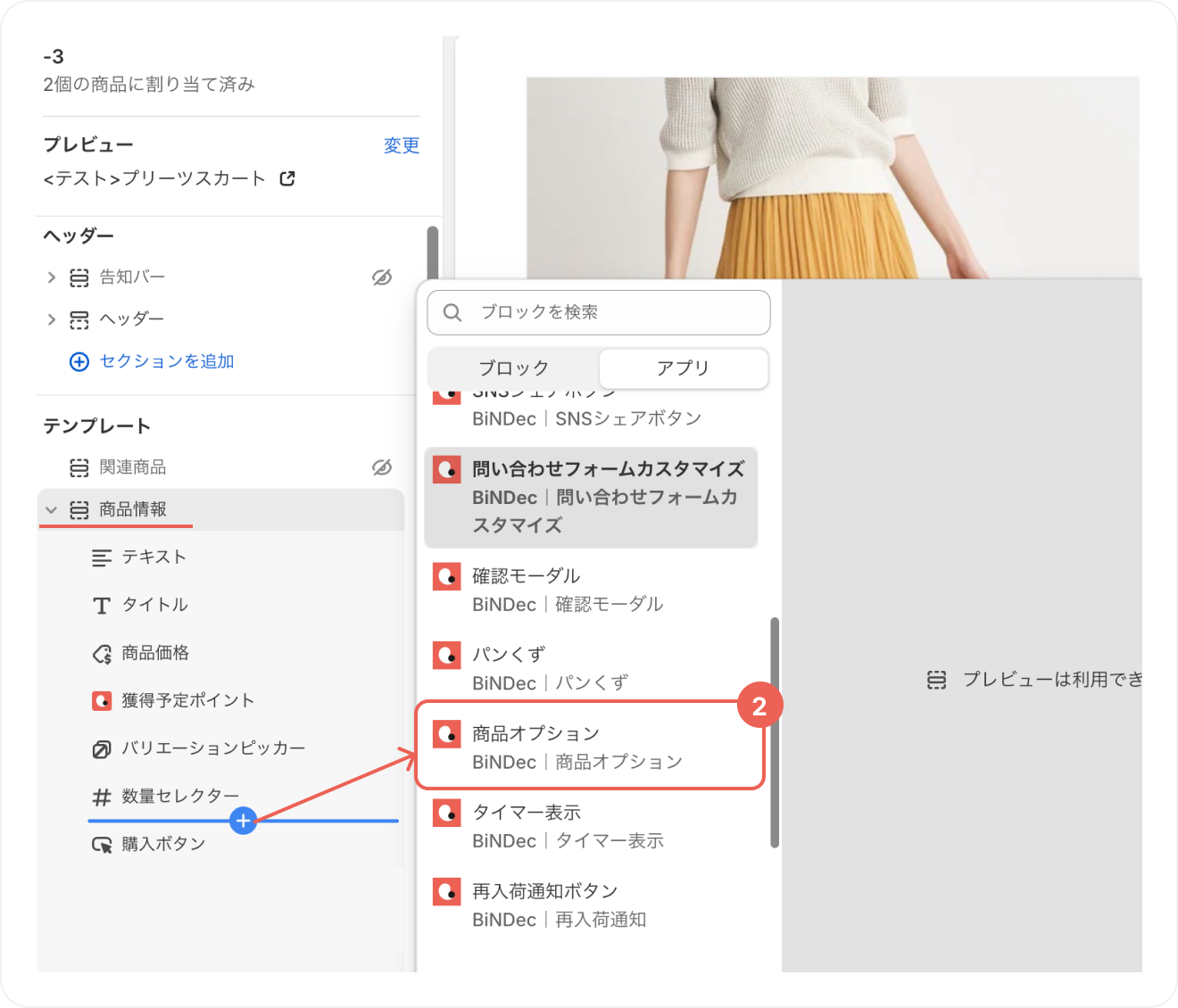 - 商品情報セクション内の任意の場所から「ブロックを追加」>アプリブロック「商品オプション」を選択します。
