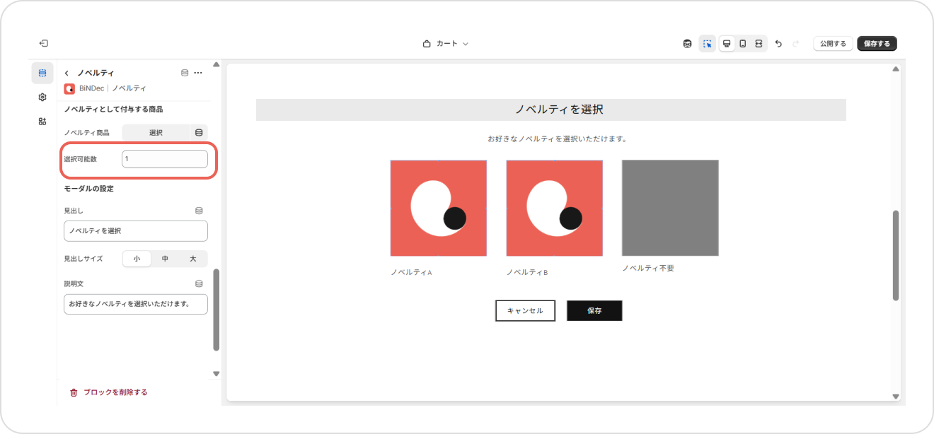ノベルティ商品を複数設定している場合、お客様が選択できるノベルティ商品の数を設定できます。