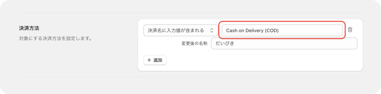 指定する決済名は各決済がShopifyで内部的に保持している名称のため