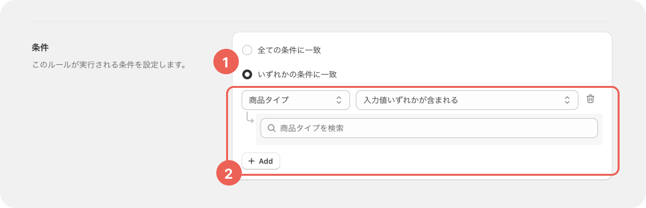「全ての条件に一致」もしくは「いずれかの条件に一致」を選択します。